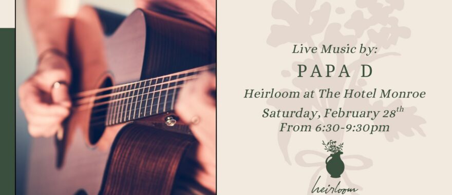 Papa D is bringing his live music to Heirloom on February 28th from 6:30-9:30pm. Come enjoy great tunes, amazing food, and a fun night out on the town!