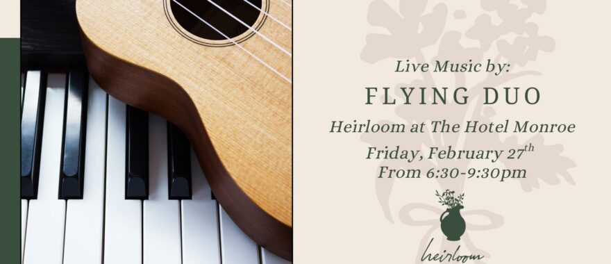 Join us at Heirloom on February 27th from 6:30-9:30pm for live jazz with The Flying Duo. Great music, exceptional food, and a relaxing night await!