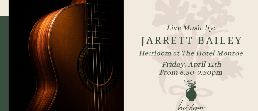 Jarrett Bailey is coming to Heirloom for a live performance. With incredible vocals, Jarrett knows how to create the perfect atmosphere for a night out. Enjoy elevated dining and some great live music.